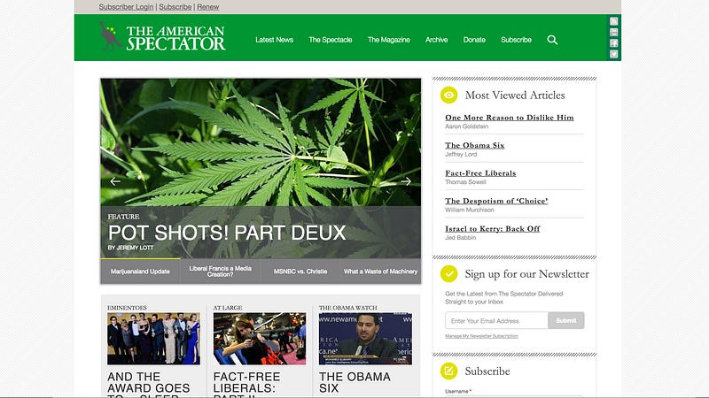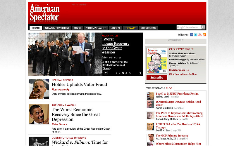 Some years ago, I worked at a (very) conservative online outlet and magazine, The American Spectator. I was essentially in charge of all things digital, photography and video. I was sold on the opportunity as a chance to recreate a digital presence for an established brand with a long history. So what it sounded like was a startup that had a ton of branding and marketing advantages. And their website looked like this.